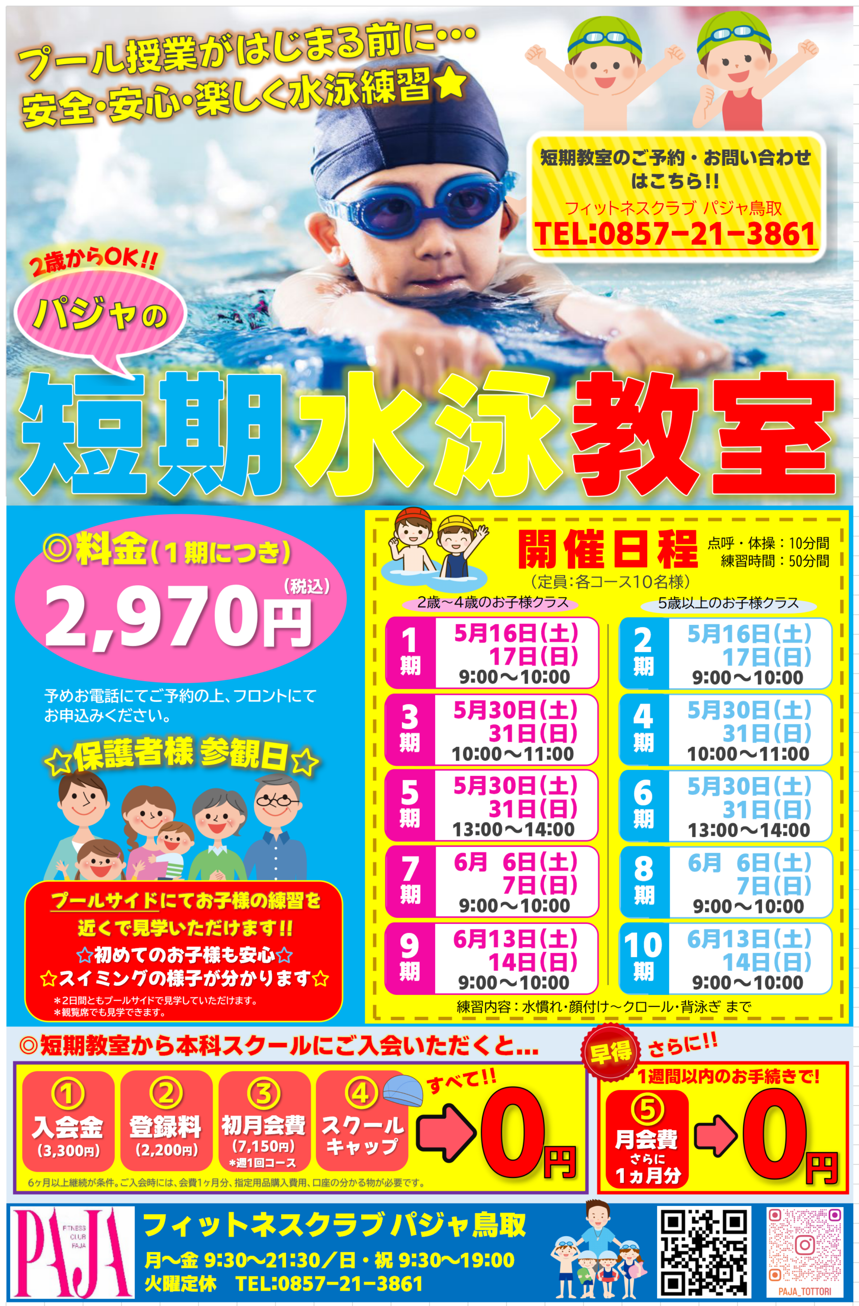 パジャ鳥取では、「短期水泳教室」を下記の日程で開催